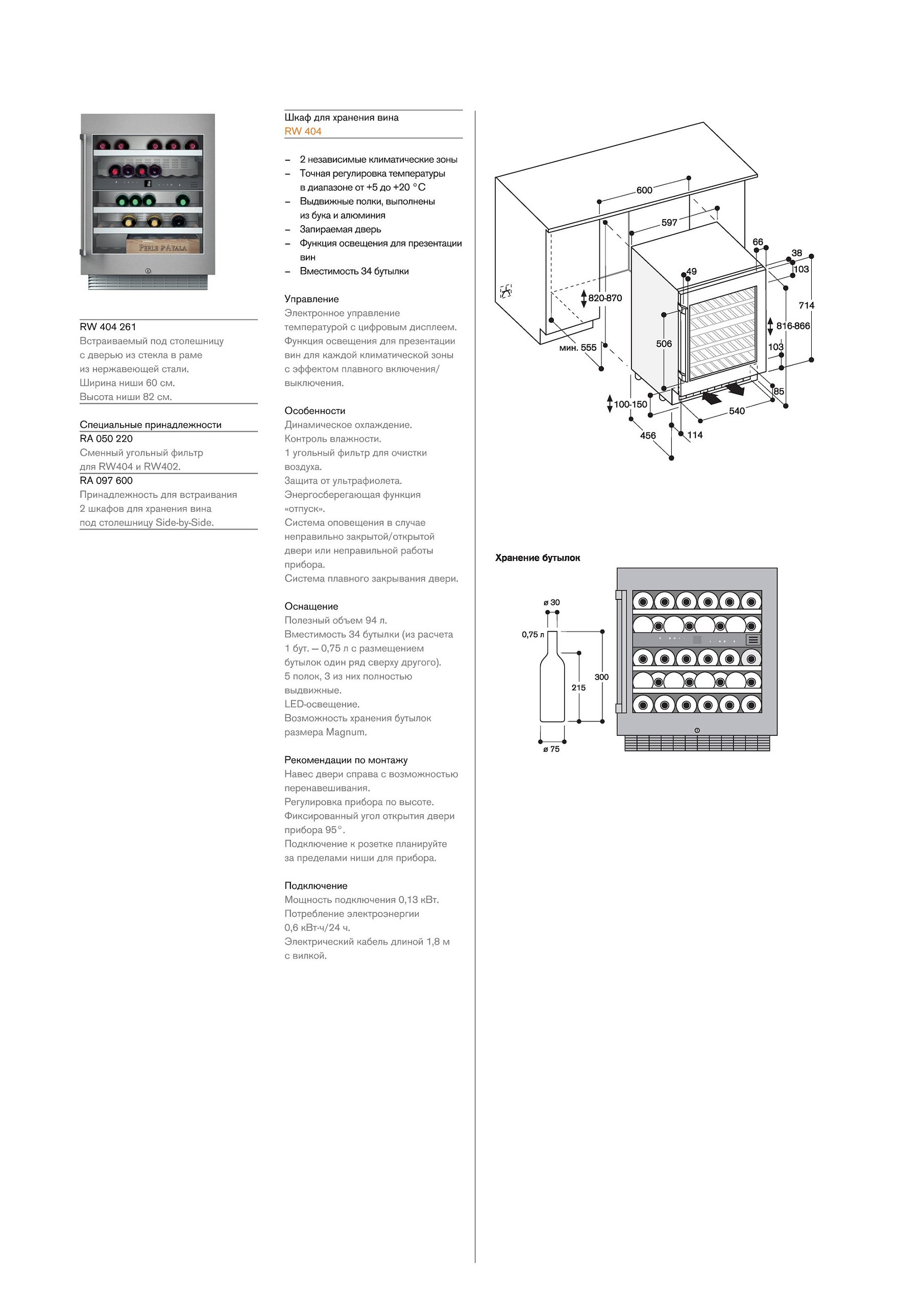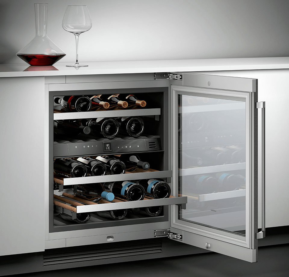 Внутри предусмотрено место для 41 бутылки, которые сохранят свои драгоценные качества благодаря оптимальным условиям хранения. Для белого и красного вина, а также шампанского предусмотрены две раздельные климатические зоны с плавной регулировкой температуры в диапазоне от 5 до 18 °C в каждой. Для поддержания не только правильной температуры, но и необходимого уровня влажности, так важного для сохранения превосходного вкуса, в шкафу работают специальные вентиляторы.